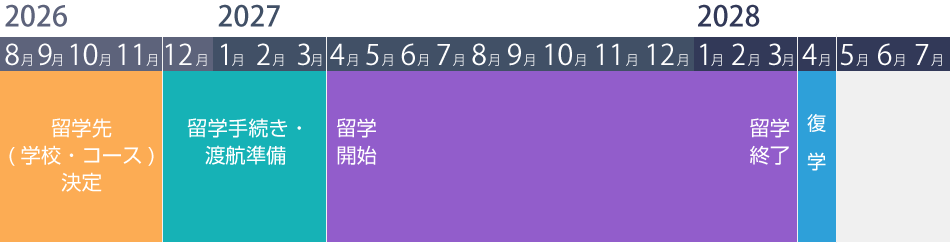 日本の大学を休学し、長期(半年~2年間)で留学する留学です。認定留学と違い休学扱いとなるので、その休学期間をどのような留学形態にするかは自由です。ただ、留学期間などにより卒業時期が遅れることも覚悟しなければなりません。大学の担当の方と復学後の状況を確認して、休学期間などのスケジュールを決めてください。目的も様々英語向上を目的とした留学、就活を見据えた留学、異文化体験など日本でできない体験をする目的など、自分の希望や目的に合ったプログラム・コースや期間などを決めることになります。
